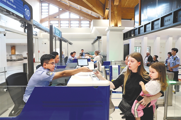 三亞鳳凰國(guó)際機(jī)場(chǎng),鳳凰出入境邊防檢查站移民管理警察為外國(guó)旅客辦理入境手續(xù)。蒙緒順 攝