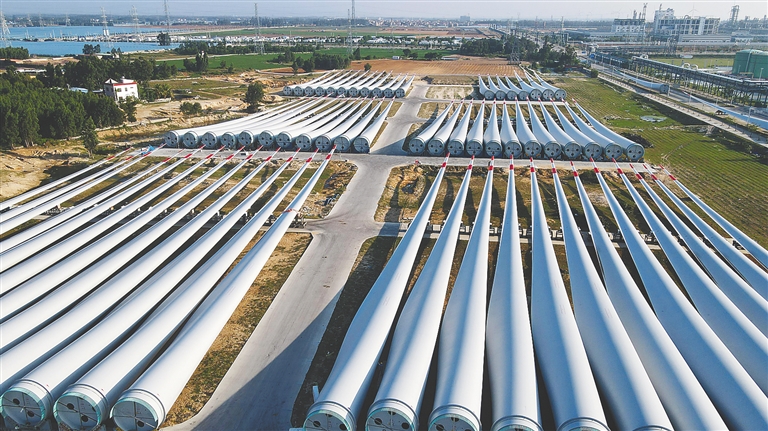 東方明陽(yáng)科技新能源有限公司高端裝備制造產(chǎn)業(yè)基地,眾多巨型風(fēng)電葉片有序排布。海南日?qǐng)?bào)全媒體記者 陳元才 攝