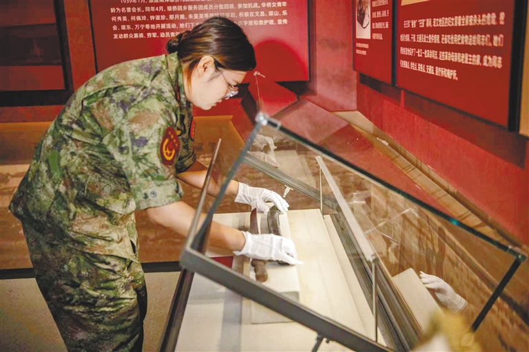 紅色娘子軍紀念館工作人員將軍刀放入展示柜。