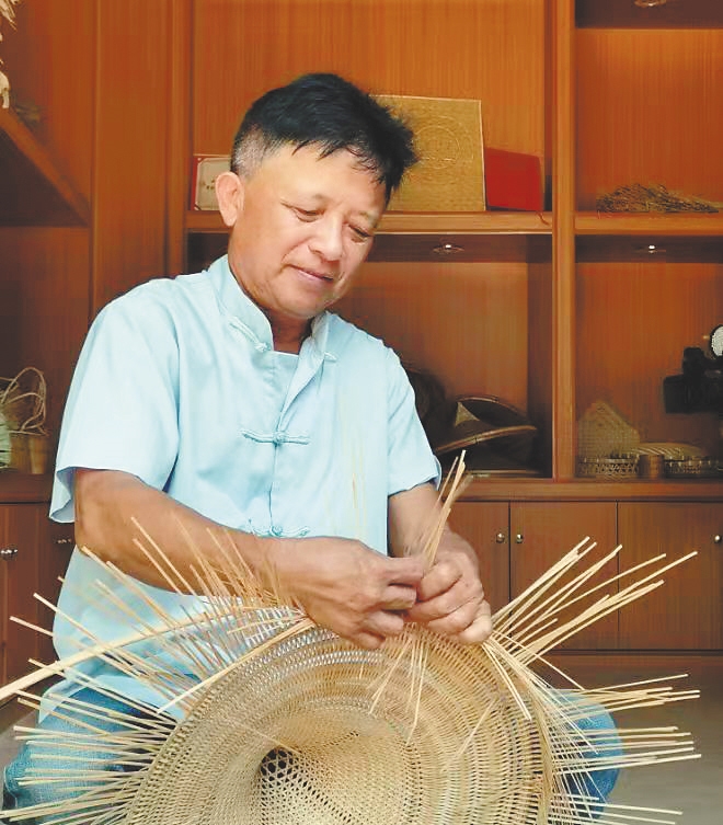 天還未亮,瓊海陽江鎮后嶺村的一間工作室里早已亮起燈光。馮增超坐在竹制工作臺前,手指翻飛,細細的竹篾在他手中逐漸勾勒出東坡笠的雛形。原來,不久前海口火山口景區向他訂了10頂東坡笠和20把竹扇,交貨期臨近,他只能趁著天亮前加班趕工——白天還要給農民工學員上課。“還有好幾所學校等著我去教孩子們編竹編呢!”他笑著說。