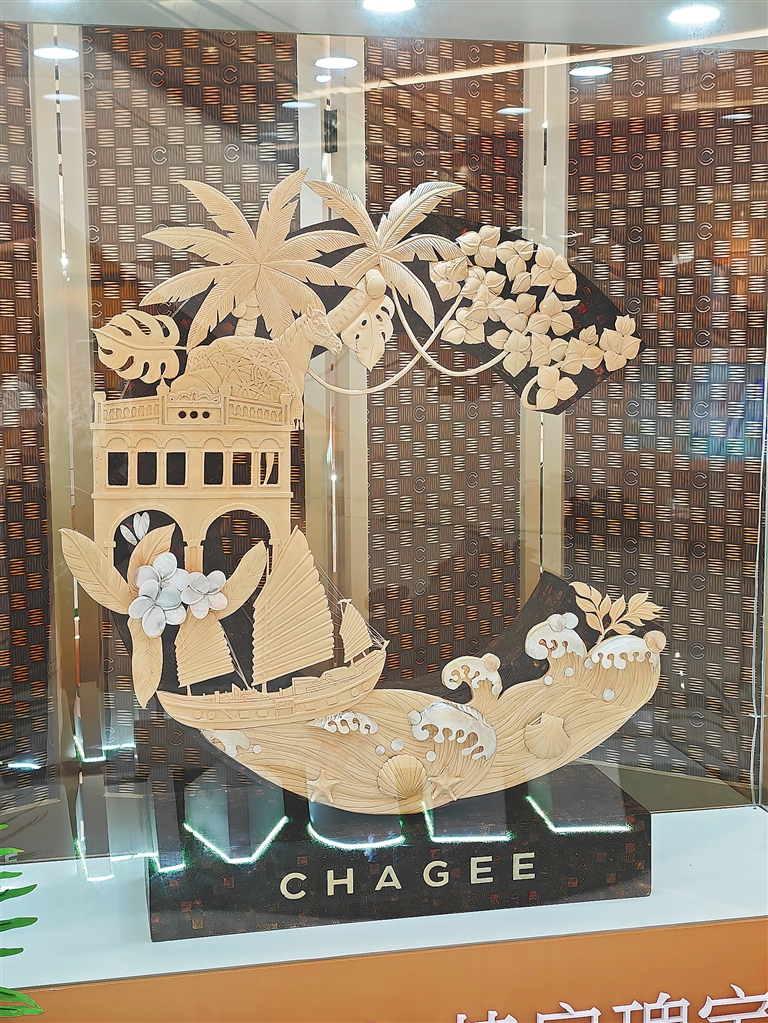 “椰殼系列文創的熱度十足,幾乎上架即售罄。”霸王茶姬海南公司總經理聶詩飛介紹,結合百店店慶,此次霸王茶姬與吳名駒傳承人合作,提取椰雕中的經典元素和典型紋樣,經過創新化設計改造,推出茶盞、冰箱貼、擺件燈以及手機鏈等文創產品,還設計了一米多高的椰雕藝術作品供展出。