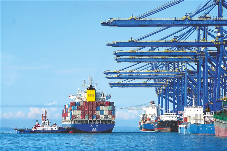 日前,在洋浦國際集裝箱碼頭內(nèi),輪船有序進(jìn)出港。海南日?qǐng)?bào)全媒體記者 陳元才 攝