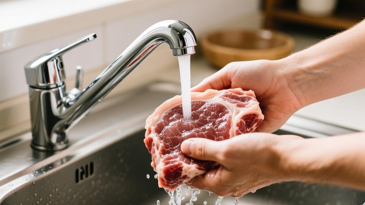 生肉表面可能攜帶多種致病菌,如沙門氏菌、彎曲桿菌、李斯特菌等。如在水龍頭下沖洗,水流沖擊肉表面時,飛濺的水滴會攜帶致病菌,污染水槽及周邊區(qū)域,包括旁邊放置的砧板、餐具、廚具,甚至是剛準(zhǔn)備好的沙拉、水果等即食食物。