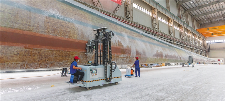 近日,在東方市臨港產業園的東方明陽新能源高端裝備產業基地生產車間,工人正在海上風電葉片下作業。