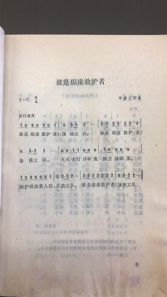 《誰是瓊崖救護者》的原詞署名作者為“平崇義”,原詞為:“誰是瓊崖救護者,亻赤(方言,相當于‘咱’)獨立隊,天天去打日本鬼,保衛亻赤瓊崖,保護瓊崖救人民,是獨立隊。”這段歌詞通俗生動地描述了中共瓊崖特委才是海南抗戰的中流砥柱。據《海南省志·文化志》記載,“平崇義”為瓊崖特委文藝宣傳干部,他也是抗戰歌曲《獨立隊之歌》《全瓊總動員》的作者。《獨立隊之歌》較短,采用海南民歌曲調,歌詞為:“獨立隊,打日本鬼,保護百姓,槍炮繳獲,幾百枝(支),四海揚名。”這首歌展現了瓊崖抗日獨立隊保護百姓、抗擊日本侵略者的功績。《全瓊總動員》歌詞稍長,其中寫道:“有力快出力,有錢快出錢,快擴大我們抗日獨立隊,一切為著打日本呀,嘿,爭取最后勝利!”這首歌采用的是陜北民歌曲調,抗戰時期廣泛流傳于瓊崖抗日根據地,在這首歌曲的鼓舞下,根據地許多地方出現了母送子參軍、妻送夫參軍的感人場景,反映出海南人民與我黨領導的瓊崖抗日武裝之間的魚水深情。