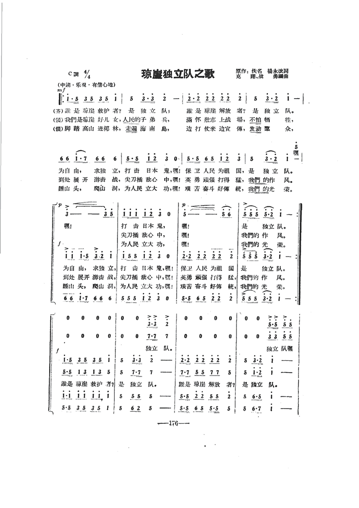 正是在這種艱苦的環境中,中共瓊崖特委在馮白駒的領導下,組織創作了許多著名的抗戰歌曲,其中《誰是瓊崖救護者》《全瓊總動員》《獨立隊之歌》(非《瓊崖獨立隊之歌》)流行一時,極大鼓舞了瓊崖抗戰軍民的戰斗意志。通過對比曲譜,可以確定《瓊崖獨立隊之歌》的原作為《誰是瓊崖救護者》,兩者曲譜基本相似,歌詞部分相同。