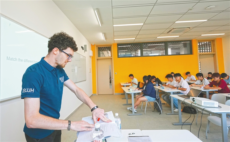 近日,在位于洋浦經濟開發區的海南比勒費爾德應用科學大學,外籍教師給學生上英語課。