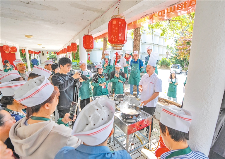 日前,在五指山市通什鎮的五指山旅游山莊,廚師們參加十大名菜十大小吃烹飪培訓。圖為該市旅游烹飪協會秘書長王仕君為學員授課。海南日報全媒體記者 李天平 攝