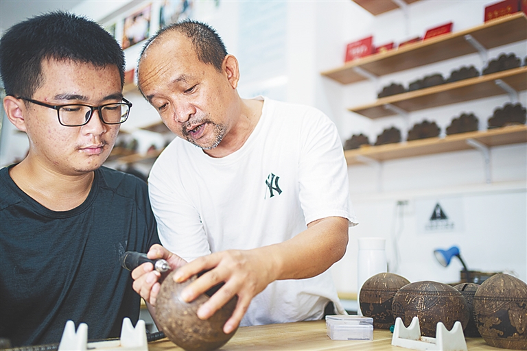 在瓊海的海南愛心椰文化產業有限公司椰文化研發基地,椰雕師傅對學員進行指導。(資料圖)