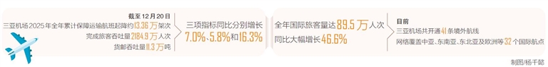 數據顯示,截至12月20日,三亞機場2025年全年累計保障運輸航班起降約13.36萬架次,完成旅客吞吐量2184.9萬人次,貨郵吞吐量11.3萬噸。三項指標同比分別增長7.0%、5.8%和16.3%。其中,旅客吞吐量創下歷史新紀錄。