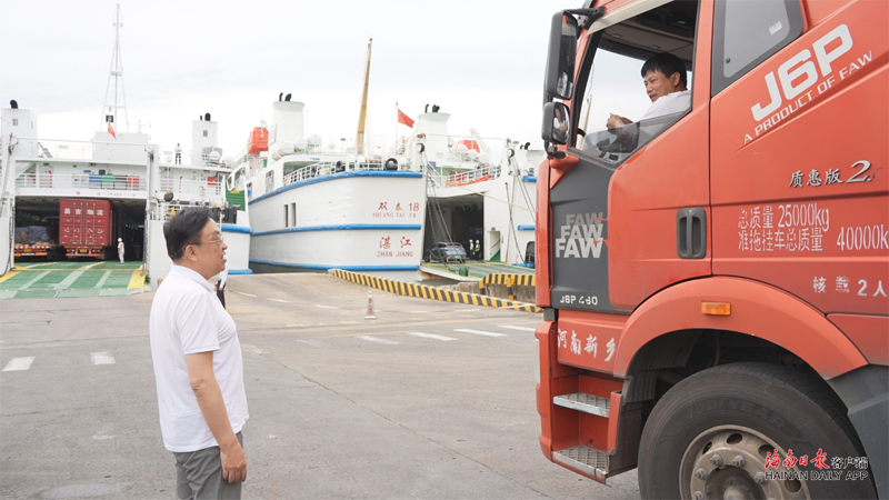 隨著臺風影響逐漸減弱,瓊州海峽各輪渡航線6日迅速恢復運行。當天下午,在秀英港碼頭泊位和新海港人車分離區,現場工作人員為司機們發放保障物資,引導待渡車輛有序登船。馮飛現場了解新能源車、大貨車等過海情況,向一線工作人員和志愿者表示感謝,并與待渡旅客、司機深入交流,祝愿他們歸途順利、中秋快樂。