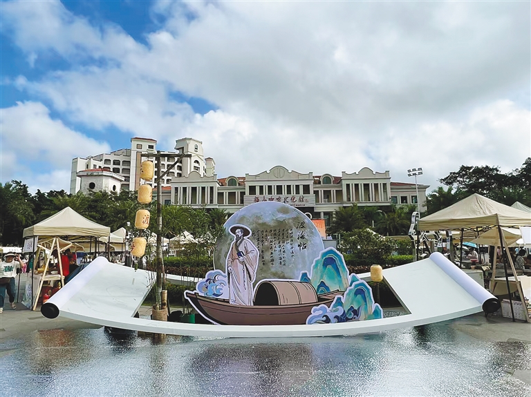 尤為引人注目的是,生活節現場設置的投個“蘇”壺、福山“丸”咖、渡海“謎”月等主題化互動游戲深受游客喜愛,同時,結合東坡先生在澄邁留下的五首詩作,設計轉詩墻打卡裝置,以此豐富海南東坡文化的體驗場景,游客完成打卡后即可集章打兌換文創冰淇淋、咖啡杯、衣服等產品。