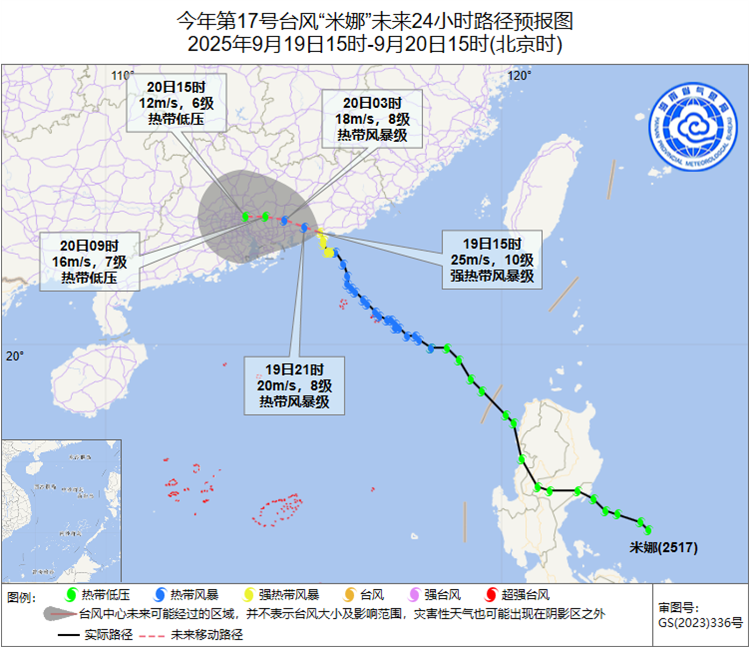 據監測,第17號臺風“米娜”已于19日上午加強為強熱帶風暴級,已于19日14時50分前后在廣東省汕尾市沿海登陸,登陸時中心附近最大風力有10級(25米/秒),中心最低氣壓990百帕。預計,登陸后“米娜”將以每小時10公里左右的速度向偏西方向移動,強度逐漸減弱。
