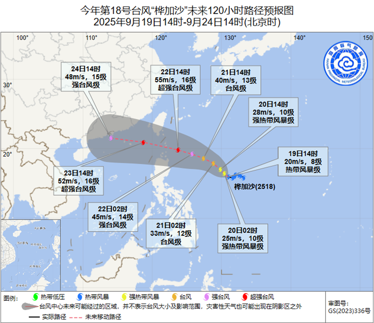 第18號臺風“樺加沙”(熱帶風暴級),19日14時其中心位于北緯15.9度、東經131.0度,即在距離菲律賓馬尼拉偏東方向約1080公里的海面上,中心附近最大風力8級(20米/秒)。預計,“樺加沙”將以每小時15公里左右的速度向西偏北方向移動,強度逐漸加強,將于23日前后進入南海,之后趨向華南沿海。