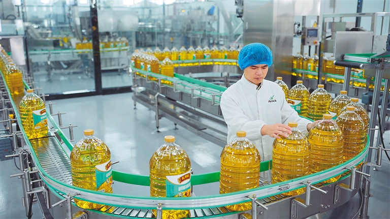 作為全國首家享受加工增值內銷免關稅政策的試點企業,海南澳斯卡國際糧油有限公司車間生產繁忙。海南日報全媒體記者 張茂 攝